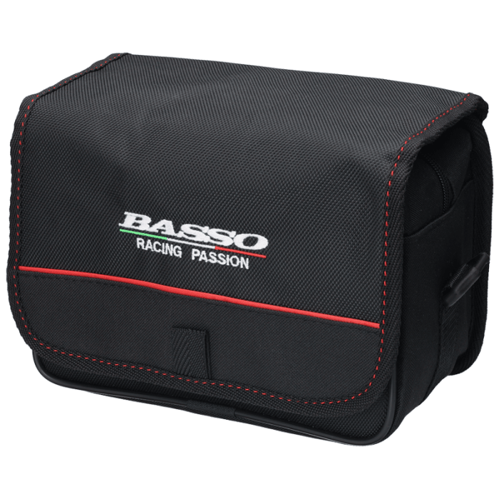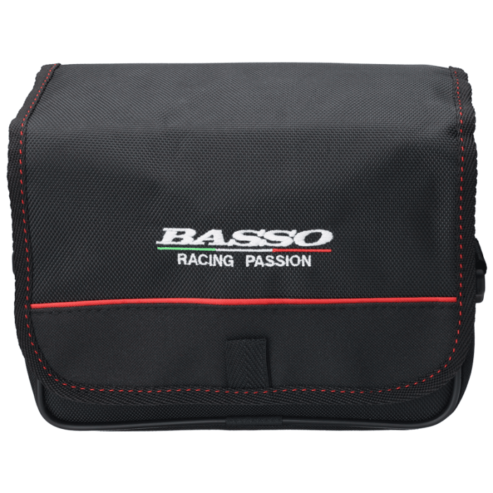 Sakwa BASSO. Turystyczna, do zamocowania na kierownicę. Cała usztywniona. Mocowanie na "Clip". W klapie, od wewnątrz posiada przeźroczystą kieszeń na mapę.Tkanina: Poliester 600D. Pojemność: 5 litrów.