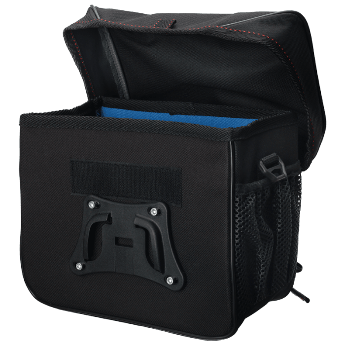 Sakwa BASSO. Turystyczna, do zamocowania na kierownicę. Cała usztywniona. Mocowanie na "Clip". Na klapie posiada zamykany mapnik. Tkanina: Poliester 600D. Pojemność: 8 litrów.
