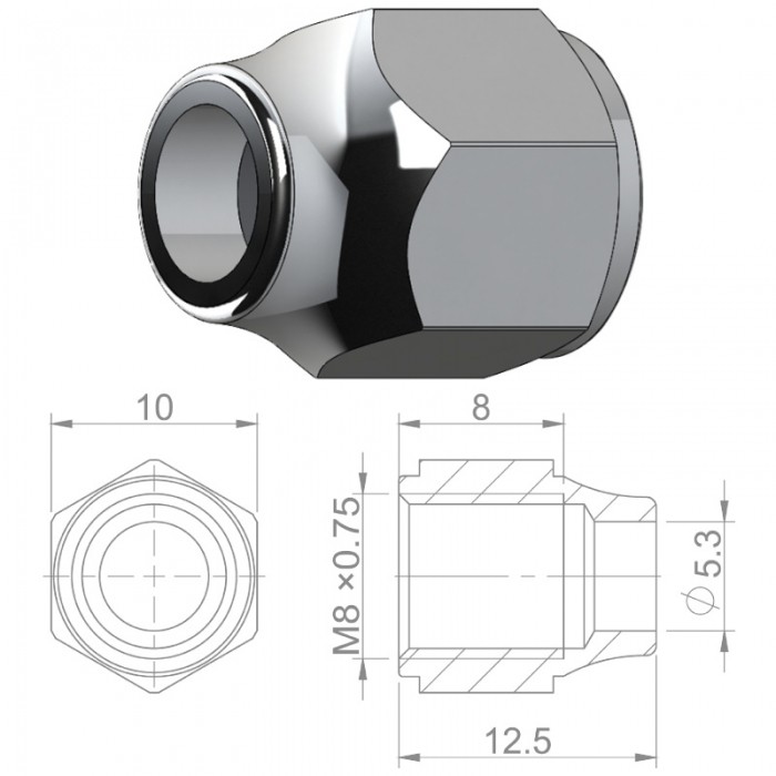 Nakrętka banjo marki BRAKCO do przewodów hamulców hydraulicznych. Materiał: Stal Nierdzewna. Gwint: M8x0.75 /8mm. Długość całkowita: 12.5mm. Otwór: 5.3mm. Pasuje do przewodów 5mm Shimano, Avid, Magura, Formula. Pakowane zbiorczo po 4szt.