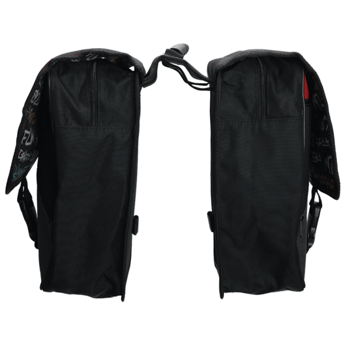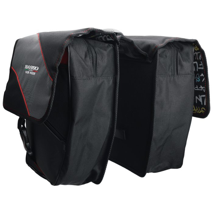 Sakwa BASSO. Dwukomorowa, zamykana suwakami przykrytymi klapami bocznymi. Boki usztywnione od strony koła. Mocowanie: Taśmy samoczepne. Tkanina: Poliester 600D. Pojemność: 28 litrów.