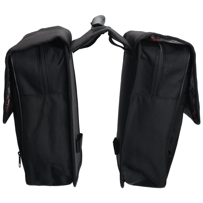 Sakwa BASSO. Dwukomorowa, zamykana suwakami przykrytymi klapami. Boki usztywnione od strony koła. Mocowanie: Taśmy na rzep. Tkanina: Poliester 600D.