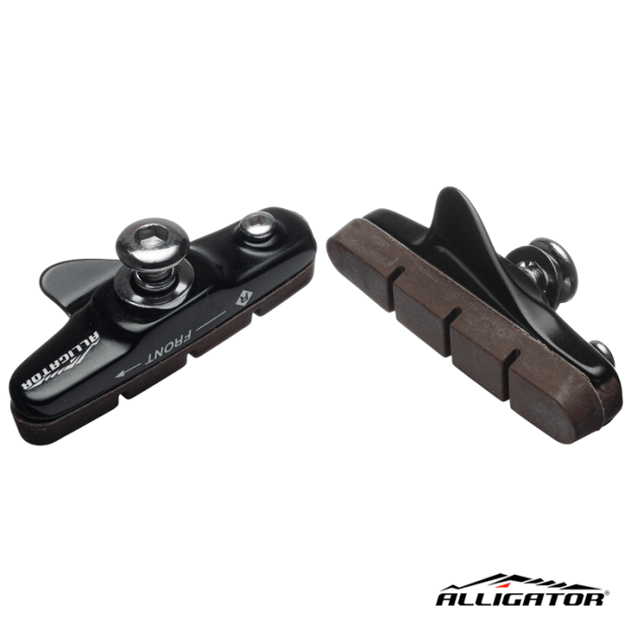 Klocki marki ALLIGATOR hamulcy obręczowych. Kartrydżowe. Obudowa: Aluminium. Do szosowych szczęk typy Caliper. Długość 55mm. Wkładki przeznaczone do obręczy karbonowych, brązowe. Mocowanie: Śruba. WAGA: ok.40gram