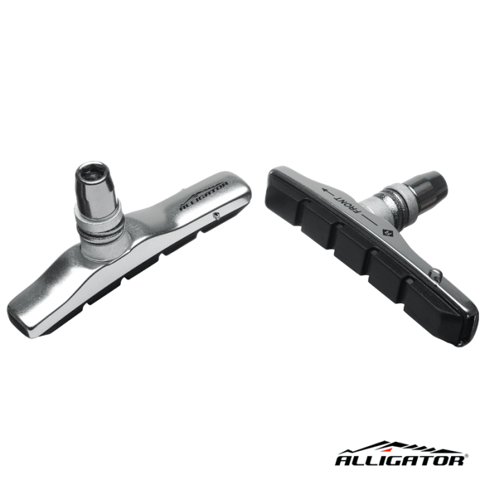 Klocki marki ALLIGATOR hamulcy obręczowych. Kartrydżowe. Obudowa: Aluminium, Srebrna. Do szczęk typy V-Brake. Długość 72mm. Mocowanie: Nakrętka. Wkładki do obręczy aluminiowych, czarne. WAGA: ok.56gram