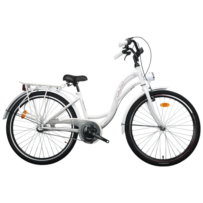 Rower marki FOLTA. Model SEDONA SWAN2. Typ: City. Rama: Stalowa. Widelec: Stalowy. Koła: 26" Aluminiowe, Podw. Przerzutki: 3 biegi (w pieście) Shimano NEXUS. Hamulce: V-Brake. Akcesoria: Błotniki, Bagażnik, Oświetlenie P/T (bat.), Koszyk. Kolor: BIAŁY