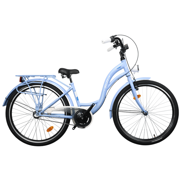 Rower marki FOLTA. Model SEDONA SWAN2. Typ: City. Rama: Stalowa. Widelec: Stalowy. Koła: 26" Aluminiowe, Podw. Przerzutki: 3 biegi (w pieście) Shimano NEXUS. Hamulce: V-Brake. Akcesoria: Błotniki, Bagażnik, Oświetlenie P/T (bat.), Koszyk. Kolor: NIEBIESKI