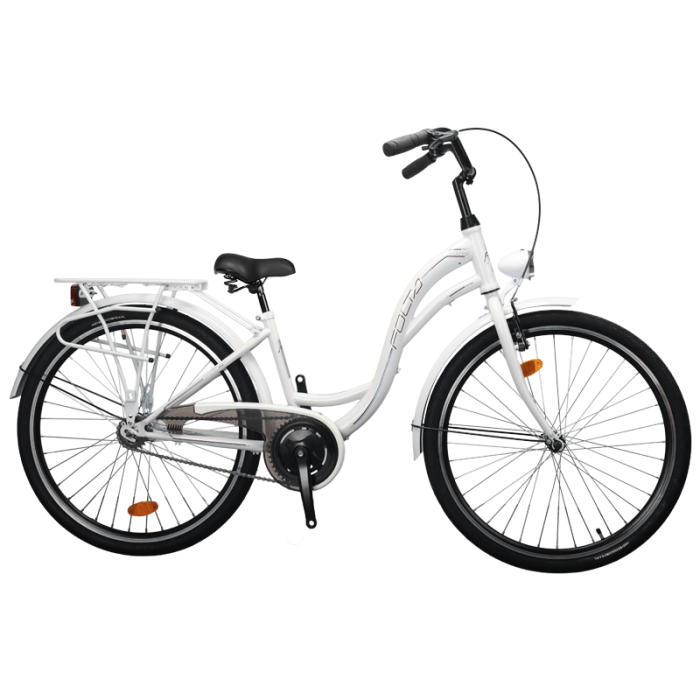 Rower marki FOLTA. Model SEDONA SWAN. Typ: City. Rama: Stalowa. Widelec: Stalowy. Koła: 26" Aluminiowe, Podw. Przerzutki: 1s Torpedo Velosteel. Hamulce: V-Brake (przód). Akcesoria: Błotniki, Bagażnik, Oświetlenie P/T (bat.), Koszyk. Kolor: BIAŁY