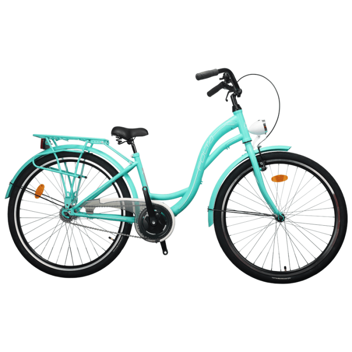 Rower marki FOLTA. Model SEDONA SWAN. Typ: City. Rama: Stalowa. Widelec: Stalowy. Koła: 26" Aluminiowe, Podw. Przerzutki: 1s Torpedo Velosteel. Hamulce: V-Brake (przód). Akcesoria: Błotniki, Bagażnik, Oświetlenie P/T (bat.), Koszyk. Kolor: MIĘTOWY