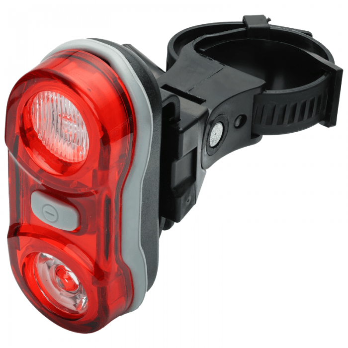 Lampa tylna mocowana na wspornik siodła. Źródło światła 2x 0.5W LED. Światło o mocy 17 lumenów. 3 tryby świecenia. Zasilanie: baterie 2 x AAA(R03).