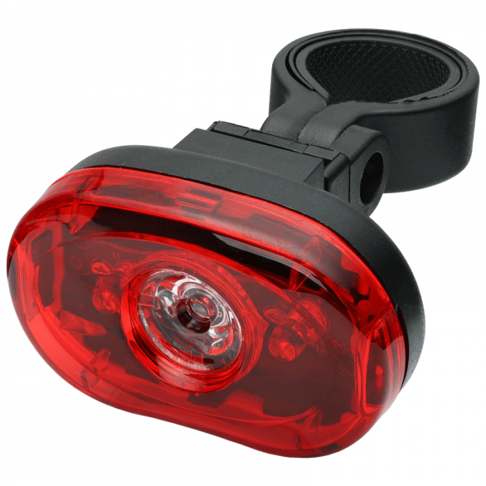 Lampa tylna mocowana na wspornik siodła. Źródło światła 1x 0.5W LED + 2x LED. Tryby świecenia: x2 (stały, migający). Zasilanie: baterie 2 x AAA(R03).