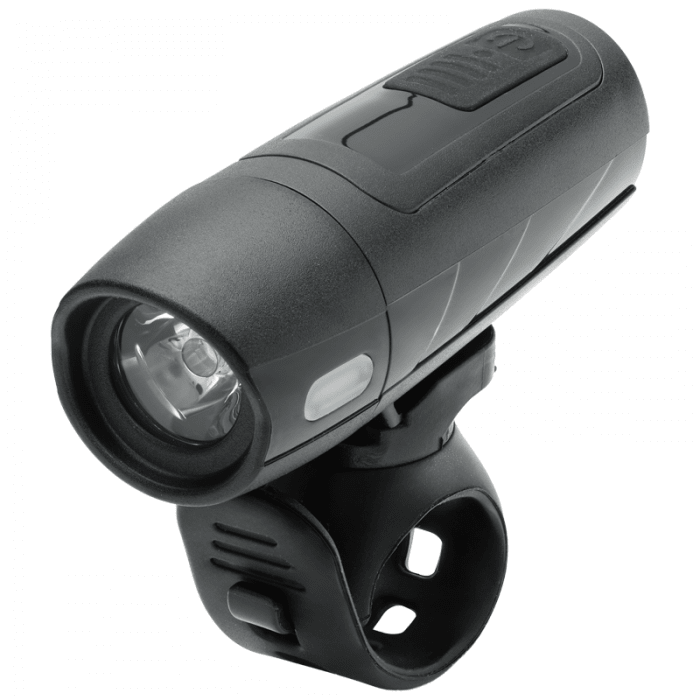 Lampa przednia mocowana na kierownicę 22mm - 31.8mm. Źródło światła 1x 3W LED. Posiada 5 trybów świecenia (3 migające, 2 stałe). Zasilanie: Akumulator 3.7V 1300mAh ładowalny przez USB. Klasa odporności na czynniki zewnętrzne IP44