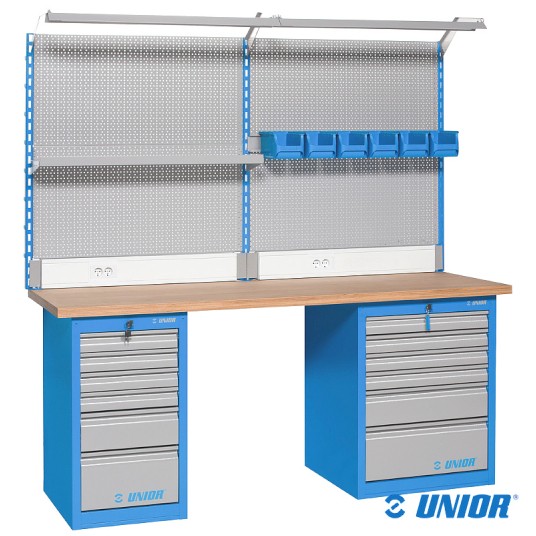 Modułowy stół warsztatowy marki UNIOR. Blat drewniany 2000x750x40mm. Wysokość stołu 910mm. Wysokość z tablicą 2025mm