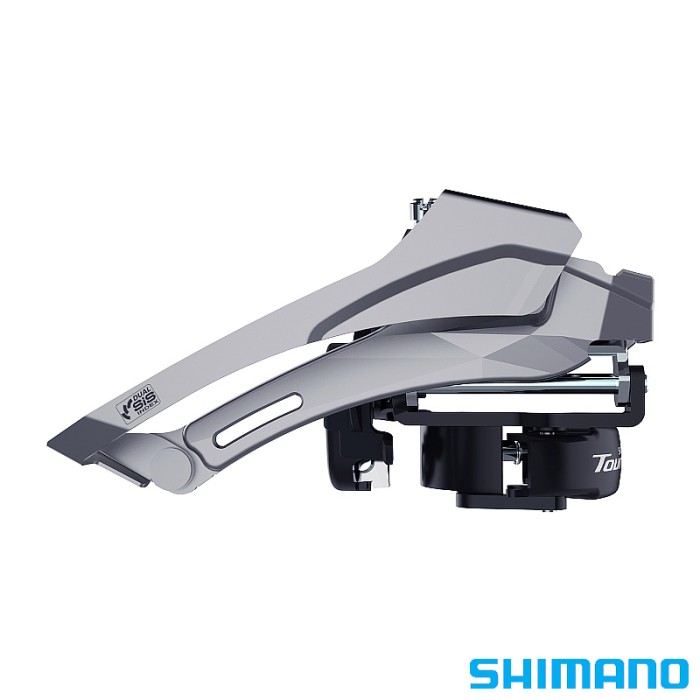 Przerzutka przednia SHIMANO Tourney. TopSwing. Ciąg: Uniwersalny. Mocowanie: Obejma 34.9/31.8mm. Do mechanizmów: 46T. Pojemność: 16T. Do napędów 2x8/2x7/2x6s. Linia łańcucha 48.8mm.