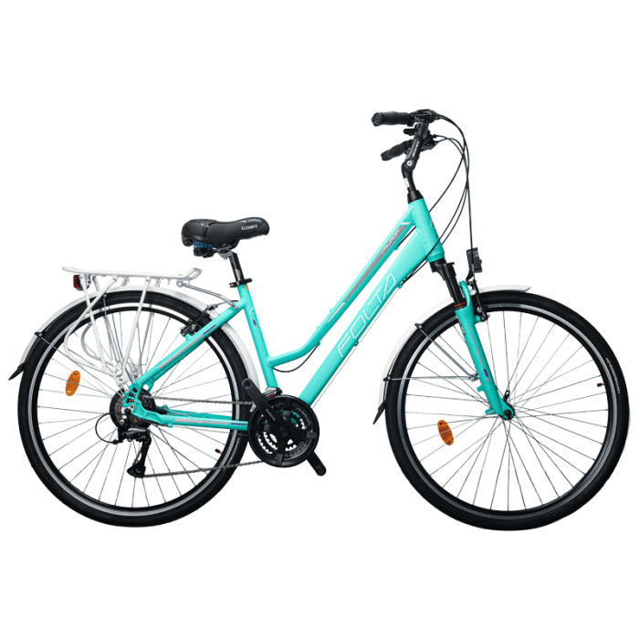 Rower marki FOLTA. Model VALADA. Typ: Treking. Rama: Alu. Widelec: Amortyzowany. Koła: 28" Alu. Przerzutki: 3x7 Shimano Acera/Tourney. Manetki: STEF. Hamulce: V-Brake. Akcesoria: Błotniki, Bagażnik, Oświetlenie P/T (bat.). Kolor: MIĘTOWY