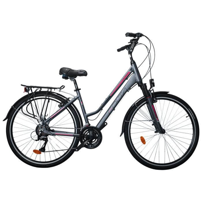 Rower marki FOLTA. Model VALADA. Typ: Treking. Rama: Alu. Widelec: Amortyzowany. Koła: 28" Alu. Przerzutki: 3x7 Shimano Acera/Tourney. Manetki: STEF. Hamulce: V-Brake. Akcesoria: Błotniki, Bagażnik, Oświetlenie P/T (bat.). Kolor: RÓŻOWY (PUDROWY)