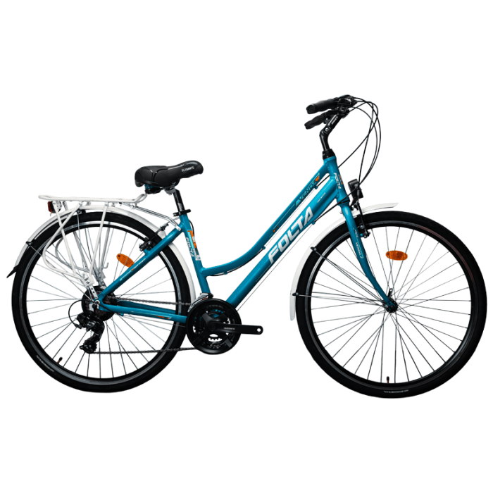 Rower marki FOLTA. Model VENDA. Typ: Treking. Rama: Alu. Widelec: Stalowy. Koła: 28" Alu. Przerzutki: 3x7 Shimano Tourney. Manetki: STEF. Hamulce: V-Brake. Akcesoria: Błotniki, Bagażnik, Oświetlenie P/T (bat.). Kolor: TURKUSOWY