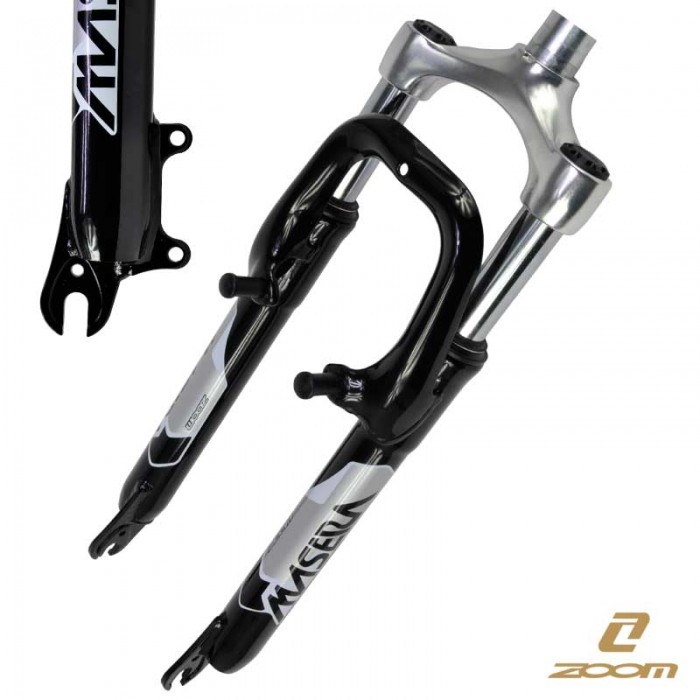 Widelec ZOOM. Amortyzowany (Sprężyna+Elastomer). Rozmiar: 27.5" (650b). Rura sterowa: Ahead 28.6x240mm. Skok: 60mm. Korona: Alu. Golenie: 25.4mm Stal. Ramiona: Stal. Piwoty pod VB. Mocowanie hamulca tarczowego IS. WAGA: ...kg