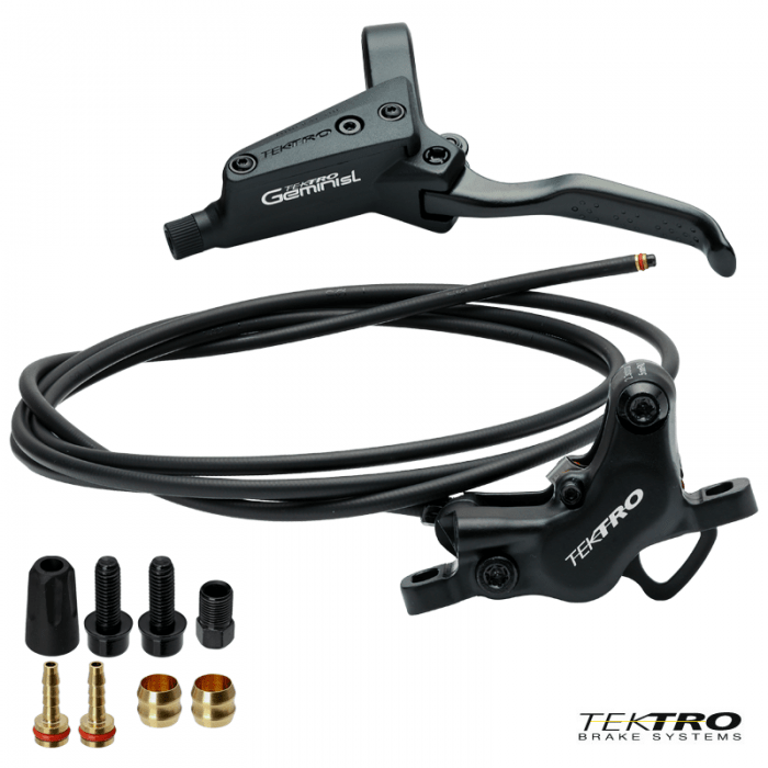 Hamulec tarczowy marki TEKTRO. Model GEMINI SL. Hydrauliczny. Dzwignia: aluminium, na 2palce, lewa. Przewód: 5.0x1900mm. Szczęka 4 tłoczkowa z mocowaniem PostMount. Okładziny Q13RS 5mm. Pod tarcze 2.3mm. Rekomendowany do e-bike'ów z silnikiem centralnym.