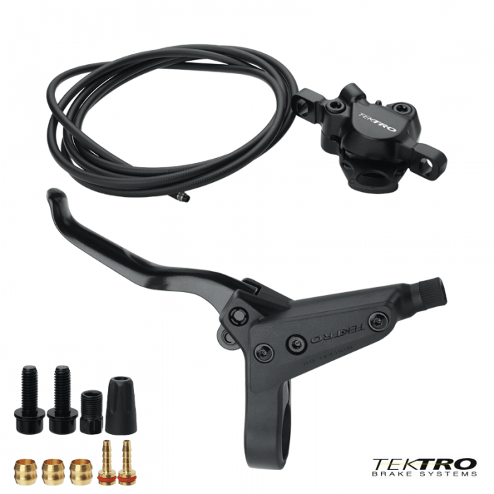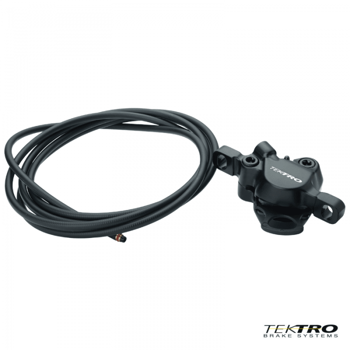Hamulec tarczowy marki TEKTRO. Hydrauliczny. Dzwignia: aluminium, na 2palce, lewa, zasięg 86-90mm. Przewód: 5.0x1900mm. Szczęka 2 tłoczkowa z mocowaniem PostMount. Okładziny E10.11. Pod tarcze 1.8mm.
