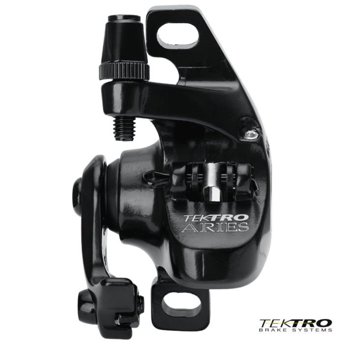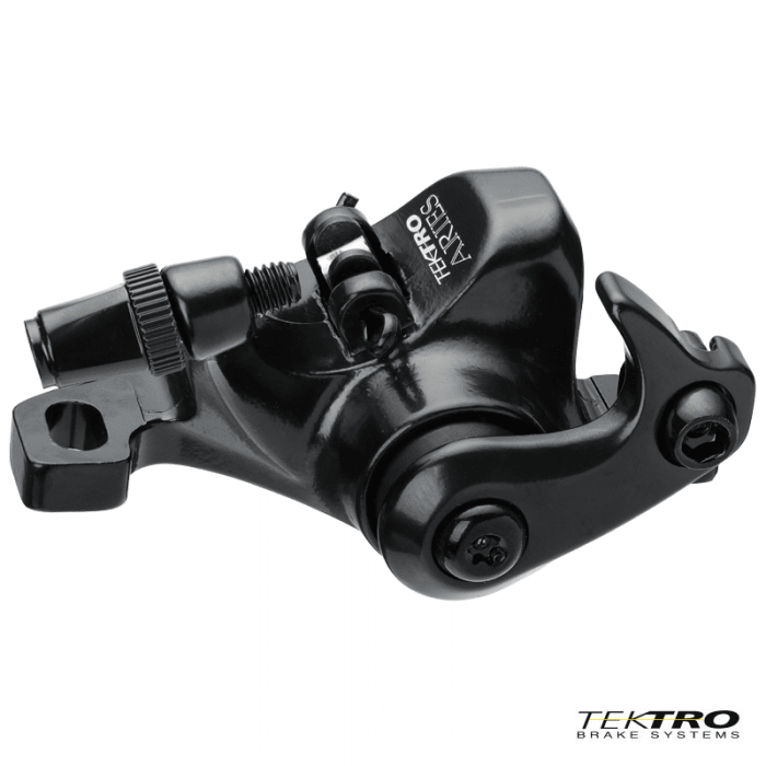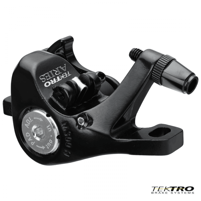 Szczęka hamulca tarczowego marki TEKTRO. Model ARIES. Mechaniczna. Przeznaczona do rowerów MTB. Mocowanie Post Mount. Współpracuje z dźwigniami V-Brake.