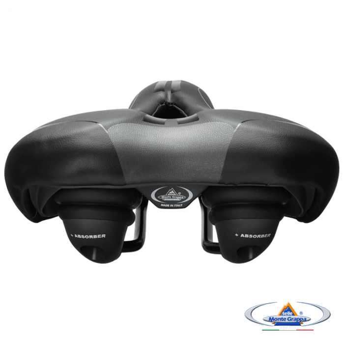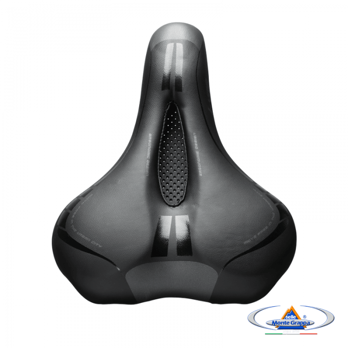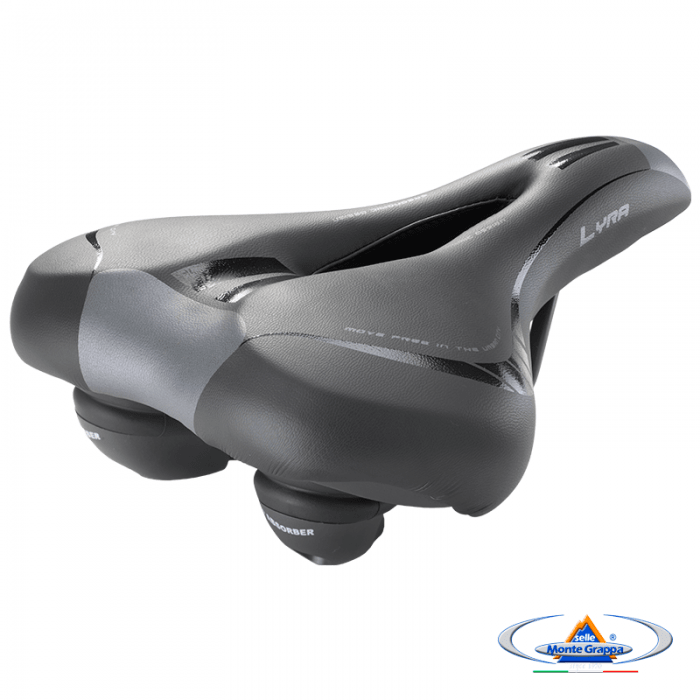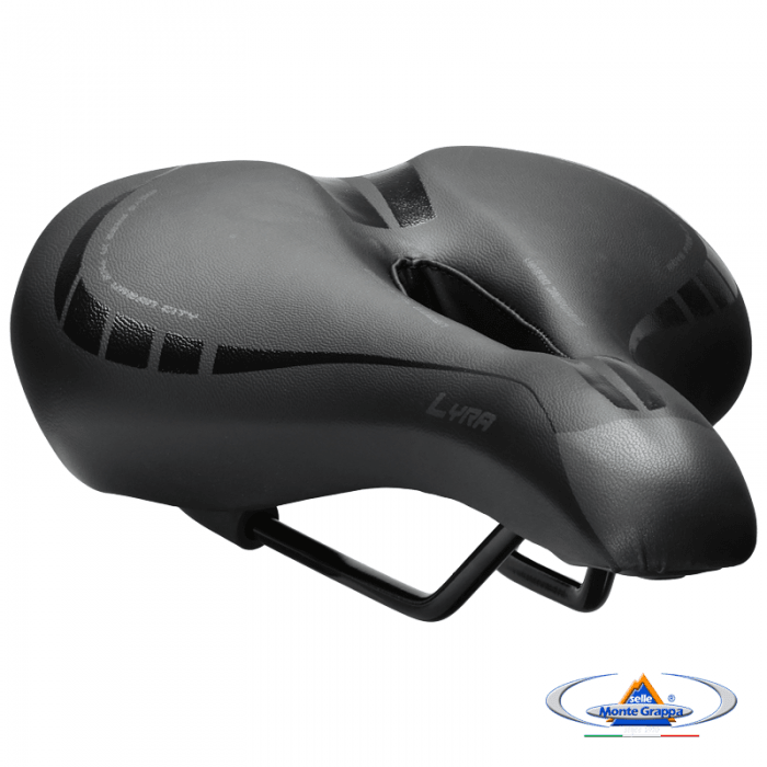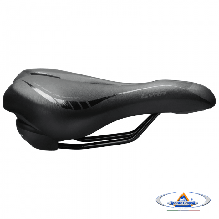 Siodło marki SELLE MONTEGRAPPA. Model LYRA. Długość 270mm. Szerokość 200mm. Szyny stalowe, okrągłe z elastomerami. Wypełnienie: SMG Memory Foam. Pokrycie: skóra syntetyczna. Skorupa: PPE. Waga ok. 447gram