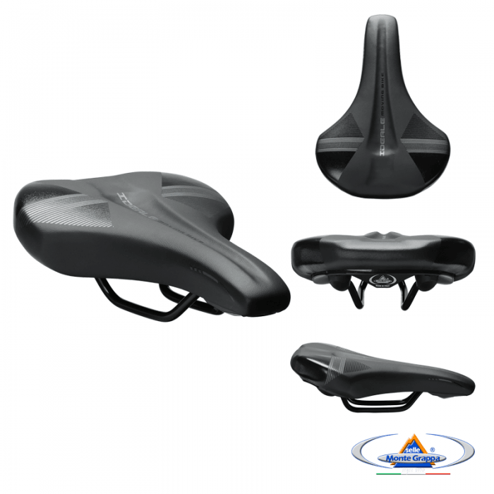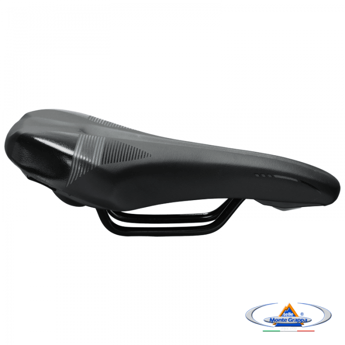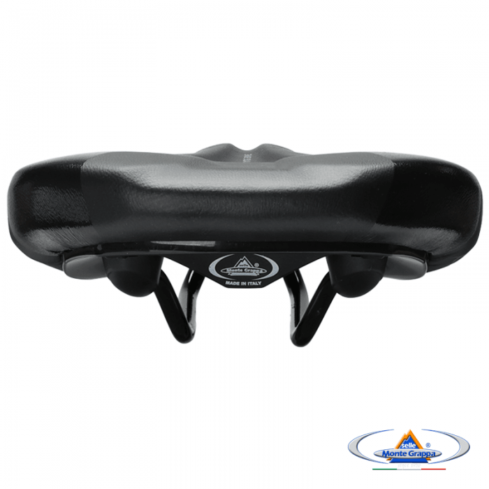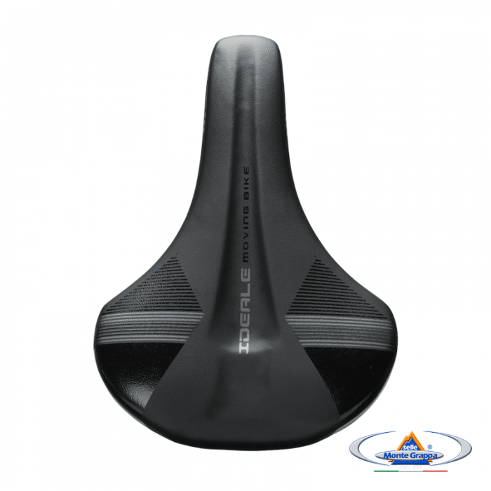 Siodło marki SELLE MONTEGRAPPA. Model IDEALE. Długość 250mm. Szerokość 170mm. Szyny stalowe, okrągłe. Wypełnienie: SMG Memory Foam. Pokrycie: skóra syntetyczna. Skorupa: PPE. Waga ok. 260gram