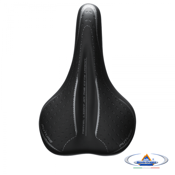 Siodło marki SELLE MONTEGRAPPA. Model FUTURE. Długość 275mm. Szerokość 170mm. Szyny stalowe, okrągłe, na sprężynach. Wypełnienie: SMG Memory Foam. Pokrycie: skóra syntetyczna. Skorupa: PPE. Waga ok. 670gram