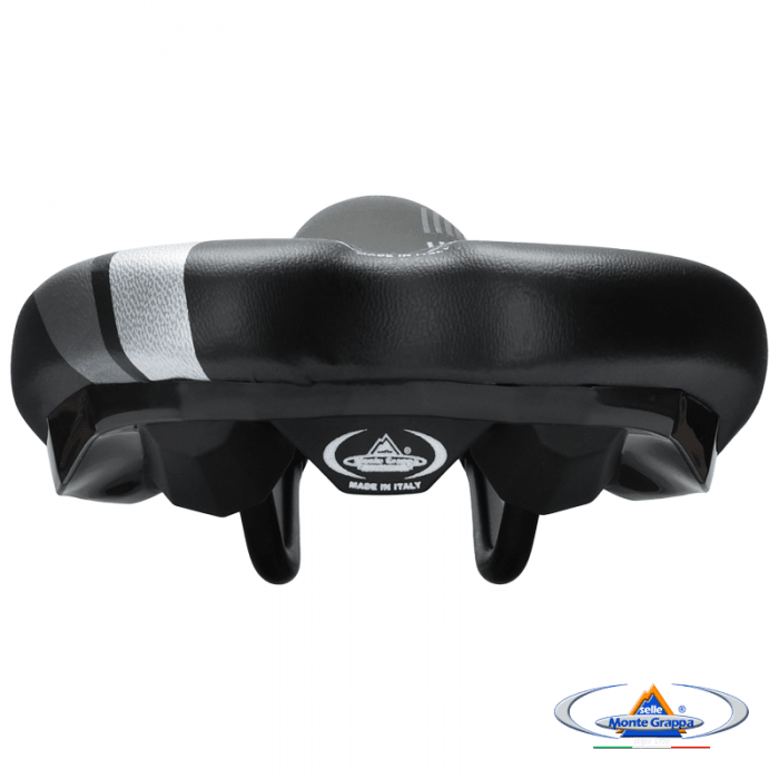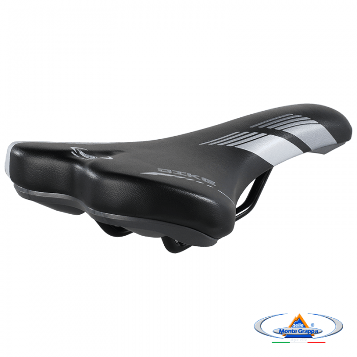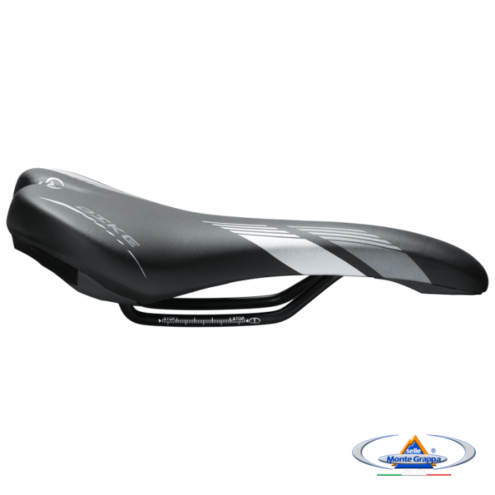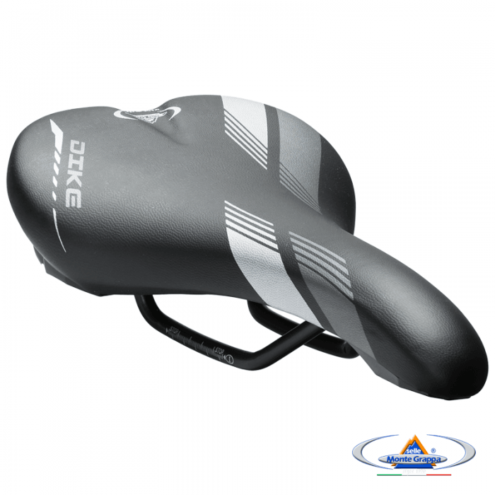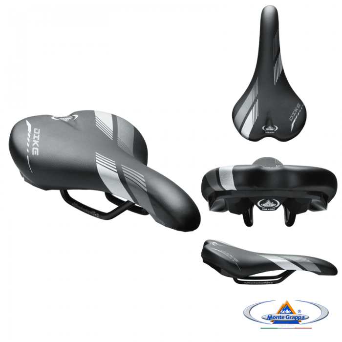 Siodło marki SELLE MONTEGRAPPA. Model DIKE. Długość 280mm. Szerokość 150mm. Szyny stalowe, okrągłe. Wypełnienie: SMG Memory Foam. Pokrycie: skóra syntetyczna. Skorupa: PPE. Waga ok. 310gram