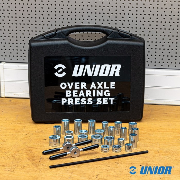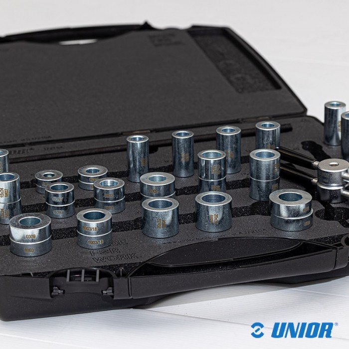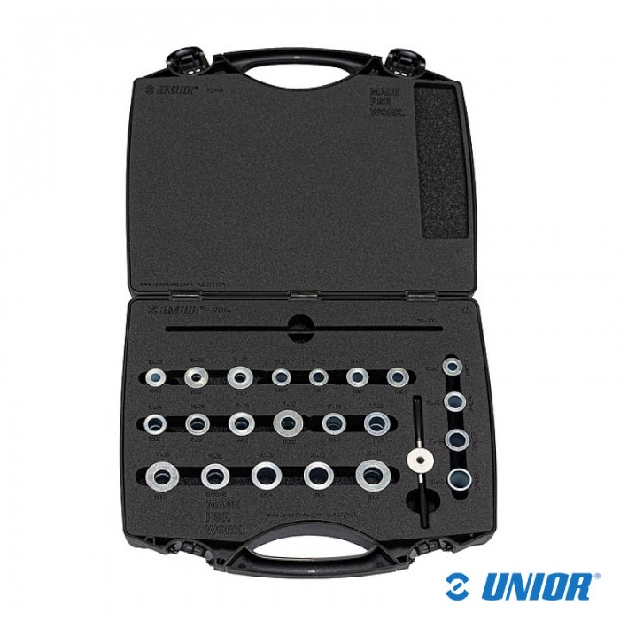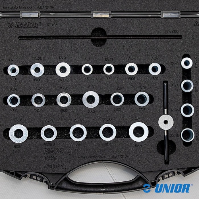 Przyrząd marki UNIOR. Przeznaczony wciskania różnych typów łożysk, nawet wraz z osią. Zestaw zawiera po 2 adaptery do łożysk: 6000, 6900, 6001, 6801, 6901, 6802, 15267, 6902, 6002, 6803, 1728, 6003, 6903/18, 6804, 6904 oraz dystanse 20x45mm, 17x45mm, 15x45mm, 10x40mm.