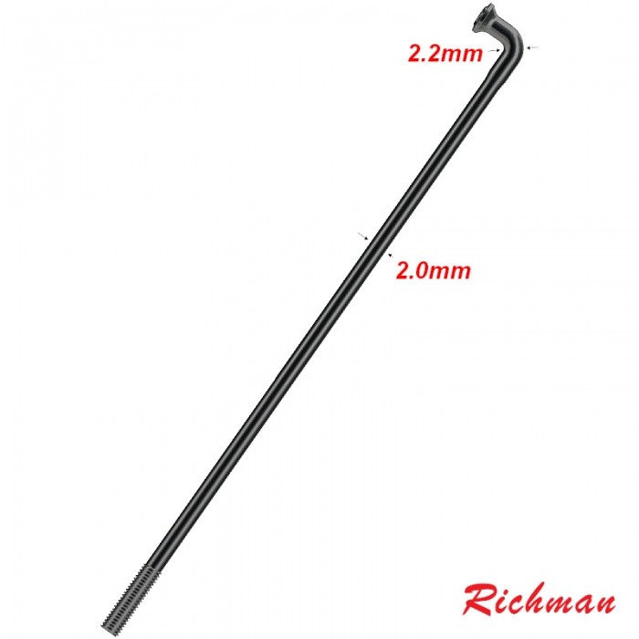 Szprychy RICHMAN CR14. Wykonane ze stali wysokowęglowej. Średnica: 2.0mm. Gwint: 2.3x9mm (BC 56, DIN 79012). Wzmocnione przy łbie - dzięki zwiększeniu średnicy w tym miejscu do 2.2mm, wytrzymałość wzrasta nawet do 20%. Pakowane zbiorczo po: 36szt.