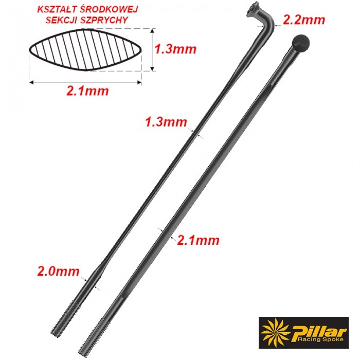 Szprychy PILLAR WING21. Materiał: stal nierdz. Sandvik T302+. Średnica: 2.0mm (14G). Eliptyczna sekcja środkowa 1.3mm x 2.1mm. Gwint: 2.3x9mm (BC 56, DIN 79012). RF - wzmocnione przy łbie(2.2mm). Pakowane zbiorczo po: 4szt. Kolor: CZARNY OXYD.