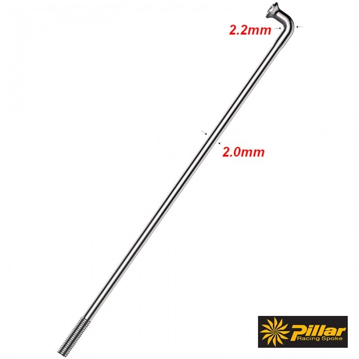 Szprychy PILLAR PSR14. Wykonane ze stali nierdz. Sandvik T302+. Średnica: 2.0mm. Gwint: 2.3x9mm (BC 56, DIN 79012). Wzmocnione przy łbie - dzięki zwiększeniu średnicy w tym miejscu do 2.2mm, wytrzymałość wzrasta nawet do 20%. Pakowane zbiorczo po: 18szt.