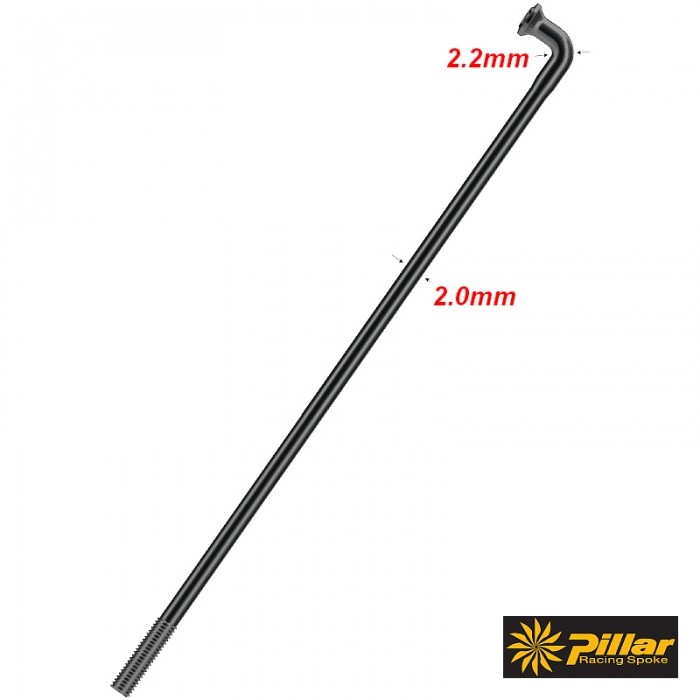 Szprychy PILLAR PSR14. Wykonane ze stali nierdz. Sandvik T302+. Średnica: 2.0mm. Gwint: 2.3x9mm (BC 56, DIN 79012). Wzmocnione przy łbie - dzięki zwiększeniu średnicy w tym miejscu do 2.2mm, wytrzymałość wzrasta nawet do 20%. Pakowane zbiorczo po: 18szt.