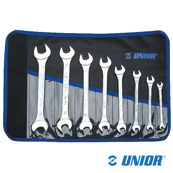 Zestaw kluczy płaskich marki UNIOR. Dwustronne w etui. Materiał: stal chromowo-wanadowa, kute matrycowo, całkowicie utwardzane i odpuszczane. W zestawie: 6x7, 8x9, 10x11, 12x13, 14x15, 16x17, 18x19, 20x22.