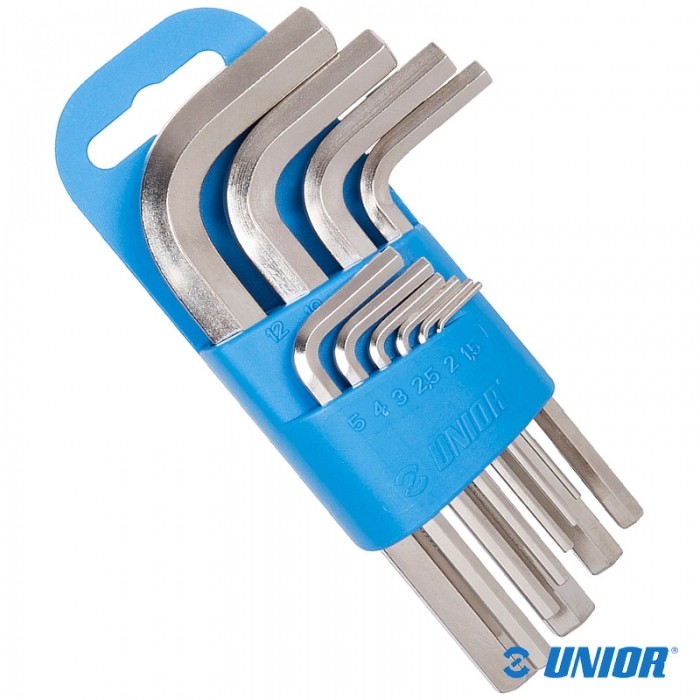 Zestaw kluczy marki UNIOR. Profil: IMBUS. Zestaw na uchwycie z PVC. Zawiera 10 rozmiarów: 1.5mm, 2mm, 2.5mm, 3mm, 4mm, 5mm, 6mm, 8mm, 10mm, 12mm.