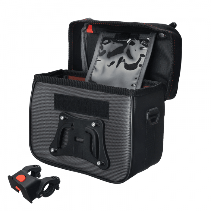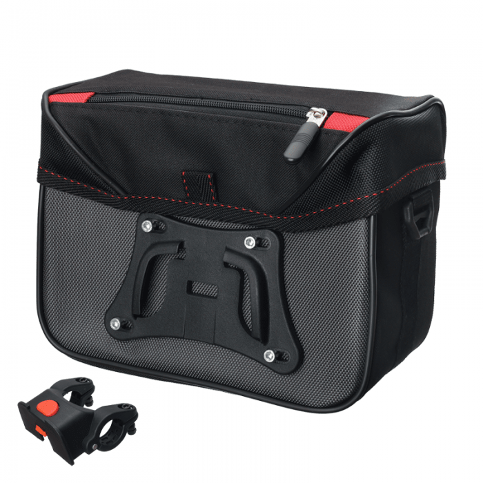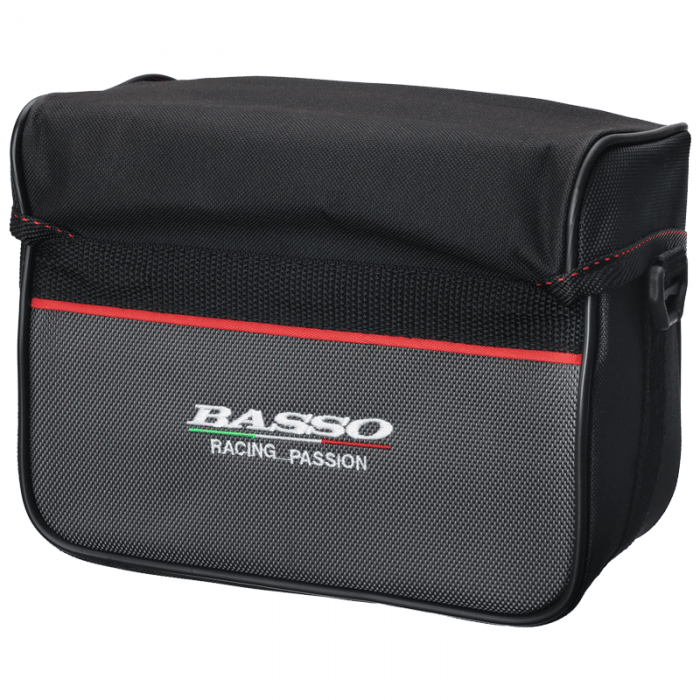 Sakwa BASSO. Turystyczna, do zamocowania na kierownicę. Cała usztywniona. Mocowanie na "Clip". W klapie posiada miejsce na nawigację lub telefon. Tkanina: Poliester 600D. Pojemność: 5 litrów.