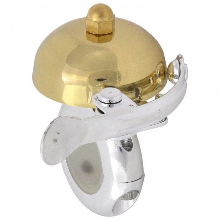 Dzwonek rowerowy. Obejma: Aluminium. Kopułka: Mosiądz 40mm. Dźwignia: Stal. Mocowany na kierownice o średnicach 22 - 25mm.