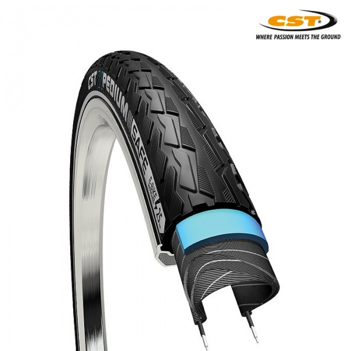 Opona marki CST. Model XPEDIUM SAFE. Rozmiar: 26" x 1.75 (47-559). Drutowa. Splot: 32TPI. Ochrona: LDP (0.7mm pas Gumy). Nadaje się do e-Bike (max 25km/h). Pasek ODBLASKOWY