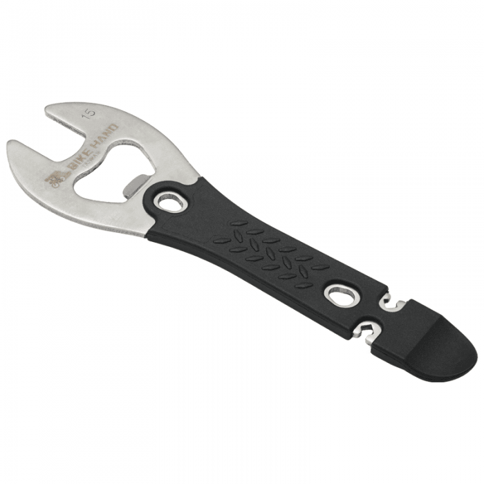 Klucz marki BIKE HAND. Materiał: Stal Nierdzewna. Klucz płaski 15mm do pedałów, klucze do nakrętek szprych 3.2mm / 3.5mm, łyżka do opon, otwieracz do butelek.