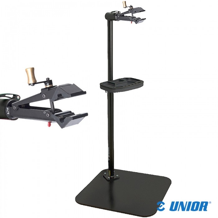 Stojak serwisowy marki UNIOR. Szczęka z mechanizmem QC/QR - do ram o średnicach 22 - 60mm. Podstawa 57x57cm. W komplecie tacka narzędziowa. Maksymalne obciążenie stojaka to 30kg. Waga: ok. 38kg.