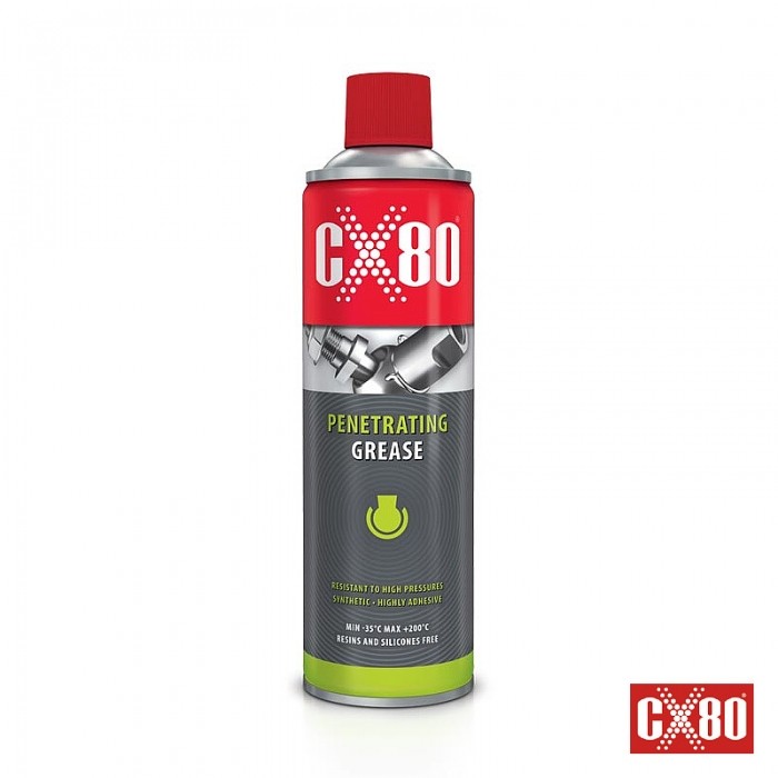 Preparat marki CX80. Smar Penetrujący. SPRAY 500ml. Doskonałe właściwości smarujące i penetracyjne. Odporny na wysokie naciski. Kompatybilny z różnymi materiałami.