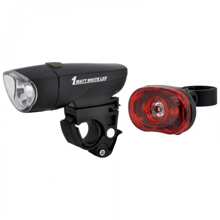 Zestaw lamp rowerowych. Źródło światła: Przód 1x 1W LED, Tył 1x 0.5W LED + 2x LED. Zasilanie: Przód - 3x AAA (LR03), Tył - 2x AAA(R03). Przód mocowany na kierownicę, tył mocowany na wspornik siodła.