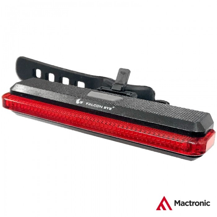 Lampa tylna marki Falcon Eye. Źródło światła: COB LED. Światło o mocy do 100 lumenów. Zasilanie: 2x AAA. Tryby pracy: 4 (2x Stały, 2x Pulsacyjny). Wymiary: 102x30x17mm. WAGA: ok.37gram