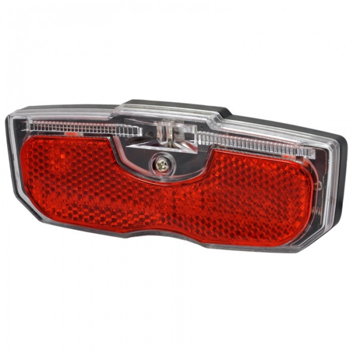 Lampa tylna mocowana na bagażnik. Źródło światła: 1x LED. Zasilanie: 2x AAA. Rozstaw śrub 80mm.