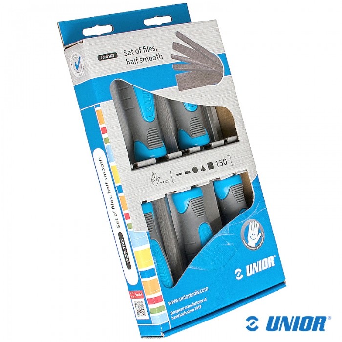Zestaw pilników marki UNIOR. Materiał: stal węglowa, twarda premium plus. Pilniki w zestawie: płaski 4x16*150mm / półokrągły 4.5x16*150mm / okrągły 6*150mm / kwadratowy 5.5x5.5*150mm / trójkątny 10.5*150mm