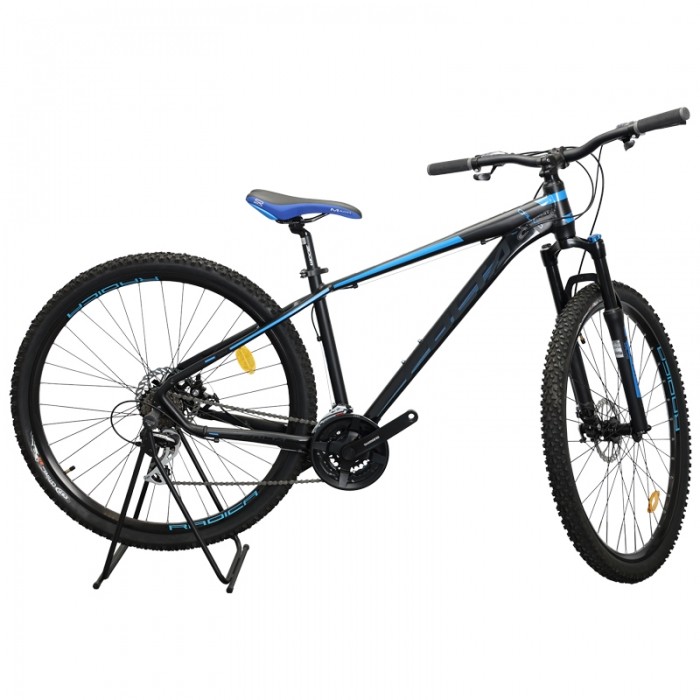 Rower marki FOLTA. Model CALVO. Typ: MTB. Rama: Aluminiowa 17". Widelec: Alu/Amort. Koła: 29" Alu. Przerzutki: 3x7 Shimano Tourney/Acera. Manetki: STEF. Hamulce: Tarcz.Mech. Shimano. Kolor: CZARNO-NIEBIESKI