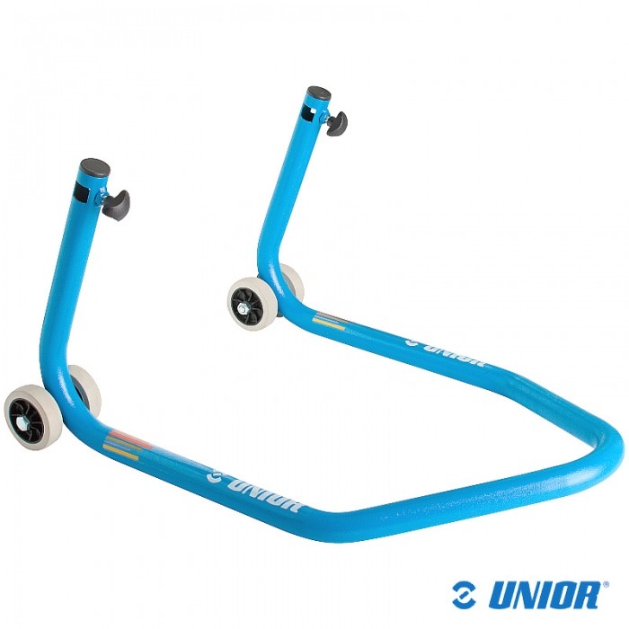 Stojak motocyklowy marki UNIOR. Przy użyciu odpowiednich adapterów, można go używać z przodu lub z tyłu. Materiał: stal konstrukcyjna. Udźwig do 200kg. Długość 705mm, szerokość 610mm, wysokość 345mm. Waga ok.4.2kg