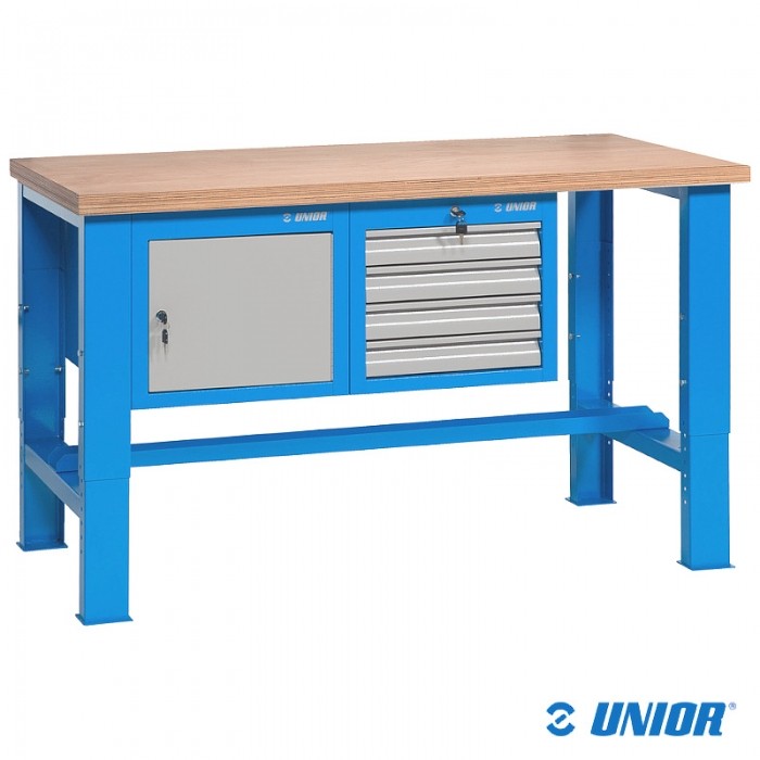 Modułowy stół warsztatowy marki UNIOR. Blat drewniany 1500x750x40mm. Wysokość regulowana od 730 do 1150mm.