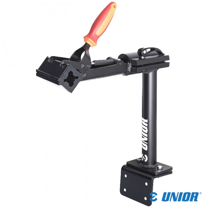 Uchwyt serwisowy marki UNIOR. Przeznaczony zamocowania zarówno na stole warsztatowym jak i na ścianę. Szczęki z nakrętką regulacyjną - do ram o średnicach 24 - 40mm.
