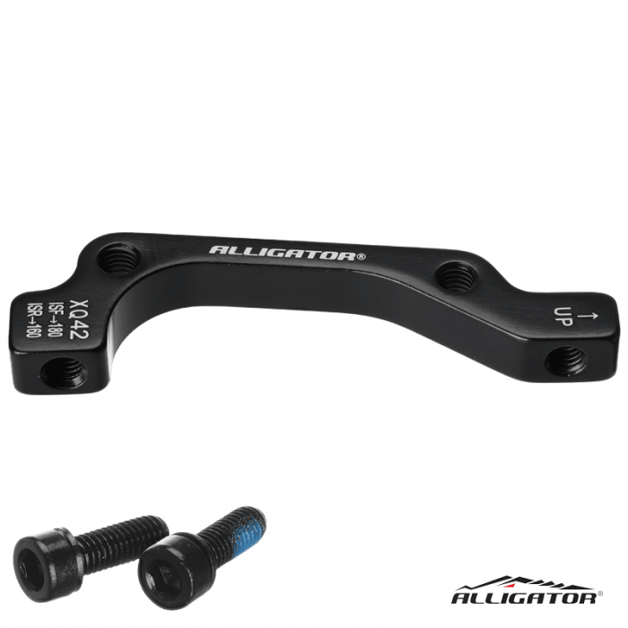 Adapter marki ALLIGATOR do szczęk hamulca tarczowego. Materiał: Aluminium. Kowersja: Widelec IS / Szczęka Post Mount 180mm, Rama IS / Szczęka Post Mount 160mm.