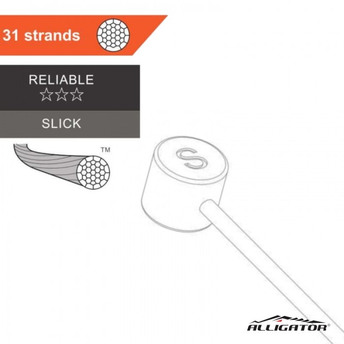 Cięgno hamulca marki ALLIGATOR. Linka 31-żyłowa ze stali nierdzewnej. Szlifowane. Końcówka 7 x 6 mm do dźwigni MTB. Średnica: 1.5mm. Długość: 3000mm.